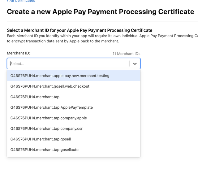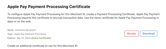 Tap uses this CSR/CER certificate to decrypt the Apple Pay token contained within the payment request sent to Tap. Payment requests that require this configuration include all Tap goSell IOS mobile SDKs and Apple Pay direct payment requests. However, the Apple Pay web SDK does not require this setup, as Tap uses its own Apple Pay certification for charges processed through our Apple Pay web SDK.