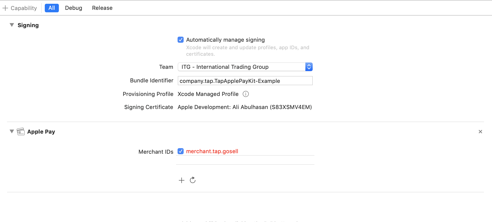 .cerfile, merchant identifier, and app bundle ID back to the Tap team. - Enable Apple Pay capability into your project from Xcode and select the merchant identifier.